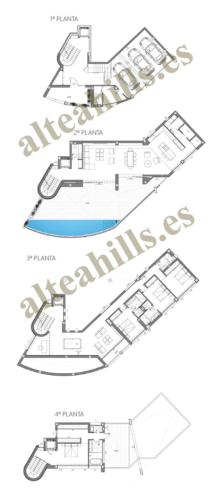 Nestled in the prestigious Blanc Altea Homes community in the Sierra de Altea, this newly built, 2025 modern villa offers an unparalleled luxury living experience. Spanning an impressive 616 m2, this four-story architectural masterpiece boasts breathtaking panoramic views of the Mediterranean Sea, lush pine forests, and the vibrant Benidorm skyline. The south-facing orientation ensures optimal sunlight throughout the day, highlighting the beauty of the surrounding landscape and creating a truly exceptional ambiance, especially during the mesmerizing sunsets.