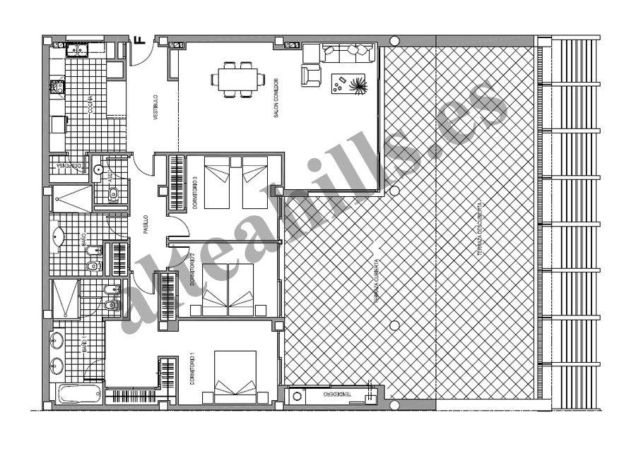 Het penthouse is voorzien van drie ruime slaapkamers en twee badkamers, plus een gastentoilet, ideaal voor gezinnen en gasten. De woonkamer baadt in het licht en biedt een open indeling die elegant overgaat in de moderne keuken. De zuidelijke oriëntatie zorgt voor een overvloed aan natuurlijk licht gedurende de dag, waardoor een warme en uitnodigende sfeer ontstaat.